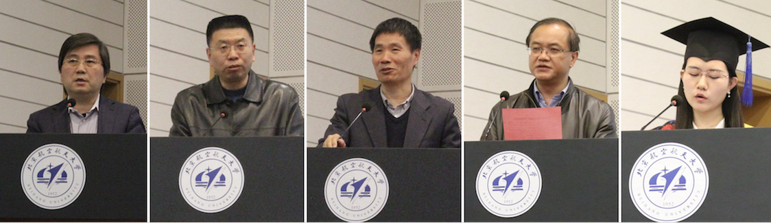 典礼开始前,到场师生共同观看了2017届研究生毕业视频,视频包含了同学们在北航两年半研究生生活的点点滴滴和学院老师对毕业生们的殷切希望和衷心祝愿。随后。毕业典礼在雄壮的国歌声中拉开了帷幕。首先,经理王自力教授发表致辞,他表扬了2017届研究生所涌现出的先进集体和优秀个人,他希望各位毕业生在日后的工作生活中“不忘初心,勇于担当;可靠做人,甘于奉献;扎实做事,求真务实;团结协作,携手奋进”,为自己人生的目标不断拼搏。随后,导师代表何益海老师发言,他对同学们的顺利毕业表示祝贺,并为各位毕业生送上祝福。接下来,学院学位委员会主席康锐教授宣读了国家奖金颁发决定,刘斌教授宣读了优秀毕业论文名单,曾声奎教授宣读了优秀毕业生名单,获奖毕业生代表在老师和同学们的掌声中上台领奖。颁奖结束后,毕业生代表魏钱锌同学上台发言,她表达了对母校的感恩与不舍,表示会牢记“为民精神”,在日后的工作中为祖国贡献自己的力量。最后,毕业典礼在赵廷弟书记的讲话中走向尾声。